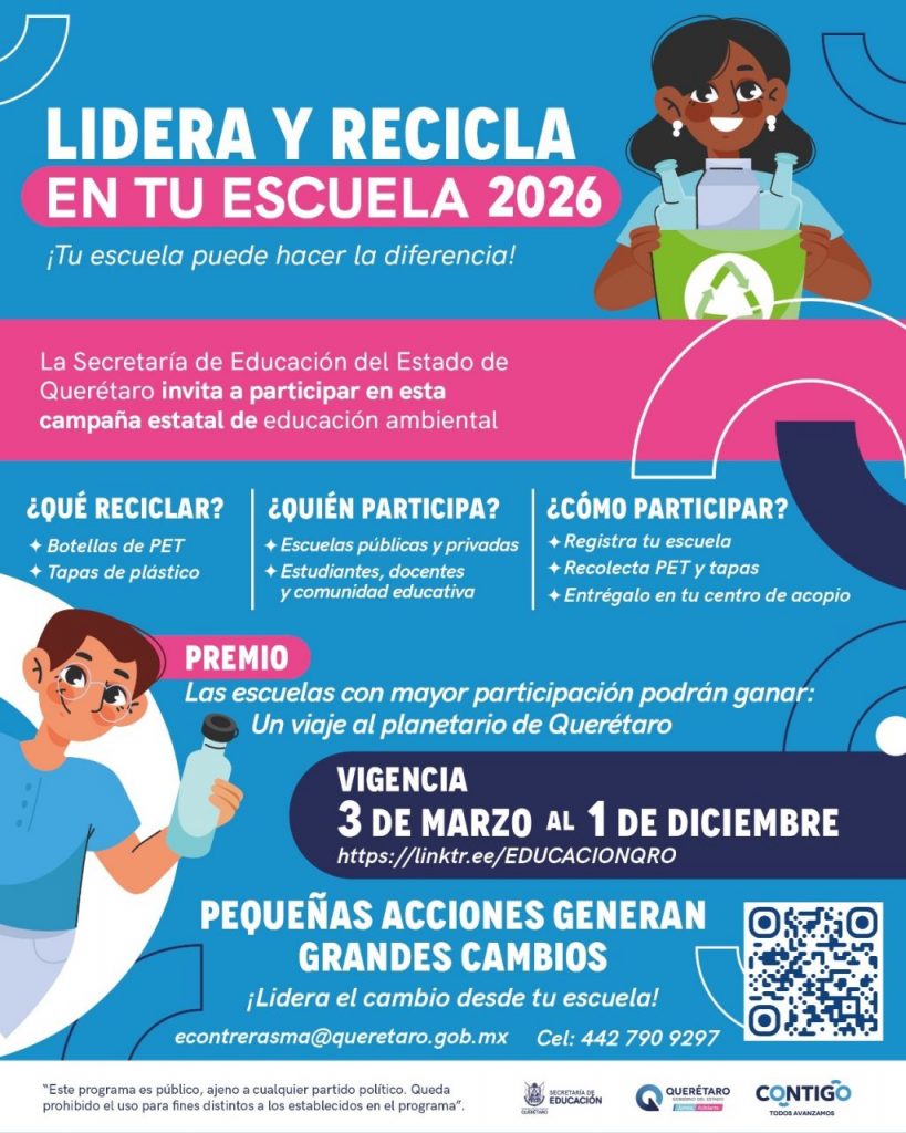 La Secretaría de Educación del Estado de Querétaro (SEDEQ) puso en marcha la campaña “Lidera y Recicla en tu Escuela 2026”, dirigida a planteles públicos y privados de todos los niveles educativos, con el objetivo de fomentar el reciclaje de botellas de PET y tapas de plástico en la comunidad escolar. La convocatoria estará abierta del 3 de marzo al 1 de diciembre.