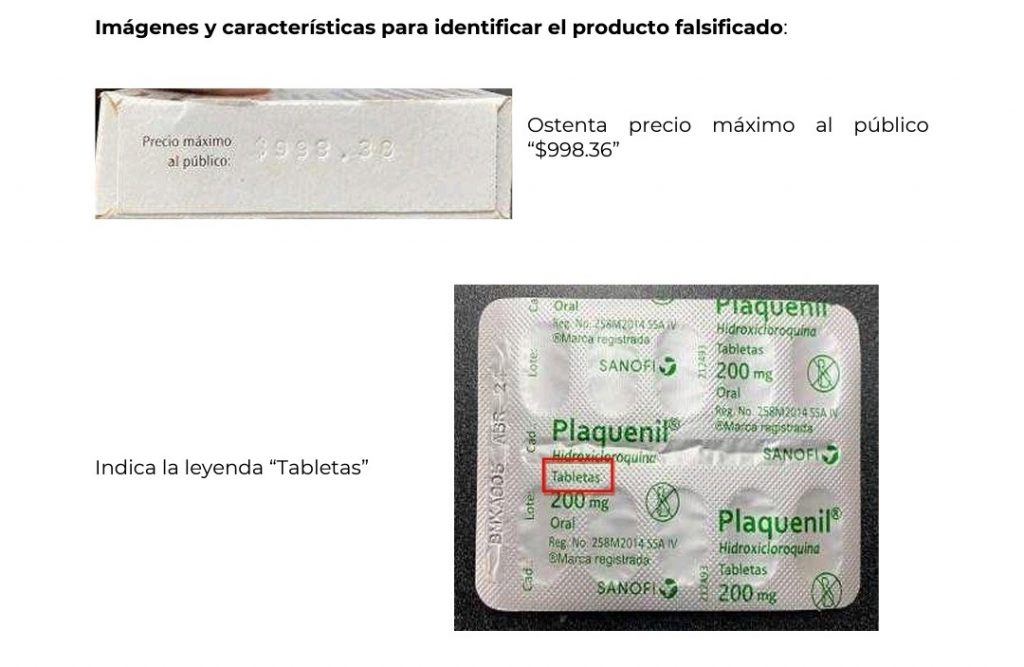 La Comisión Federal para la Protección contra Riesgos Sanitarios (COFEPRIS) emitió una alerta a la población general sobre la falsificación del medicamento Plaquenil (Hidroxicloroquina) 200 mg caja con 20 tabletas, con número de lote BMXA005 con fecha de caducidad ABR 24.