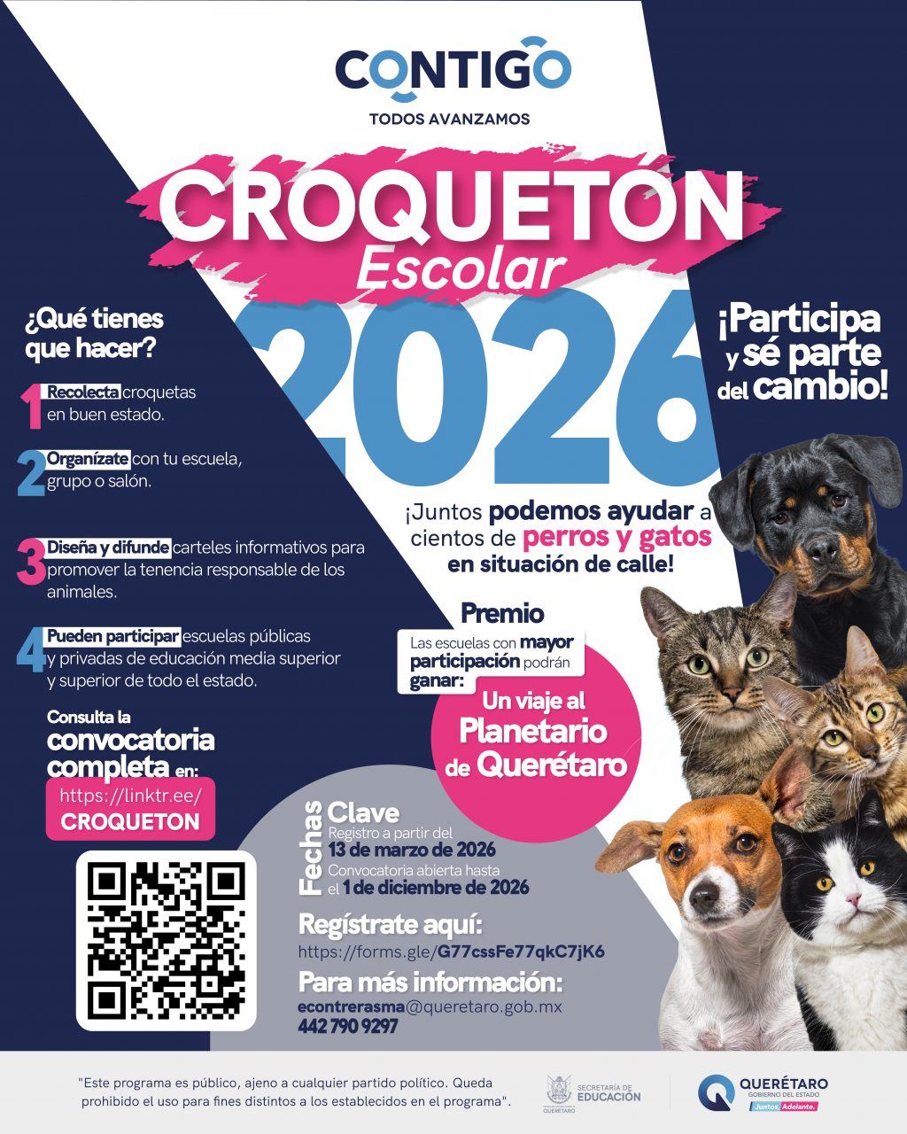 La Secretaría de Educación del Estado de Querétaro (SEDEQ) lanzó la convocatoria para la segunda edición del Croquetón Escolar 2026, dirigida a estudiantes de bachillerato y universidades públicas y privadas de la entidad con el objetivo de recolectar alimento para perros y gatos en situación de calle.
