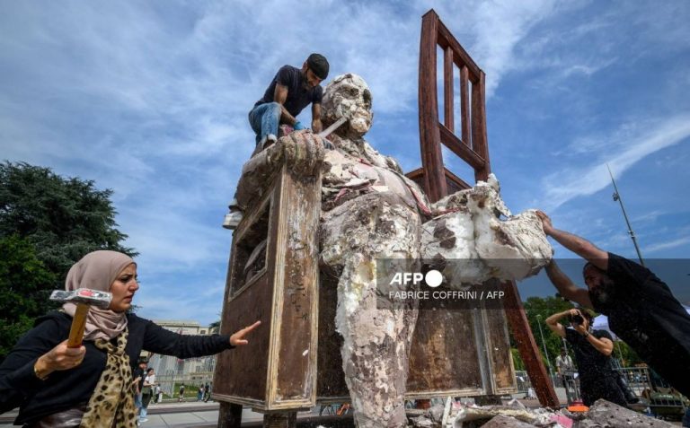 Escultor sirio destruye una de sus obras frente a la ONU, en memoria de los desaparecidos