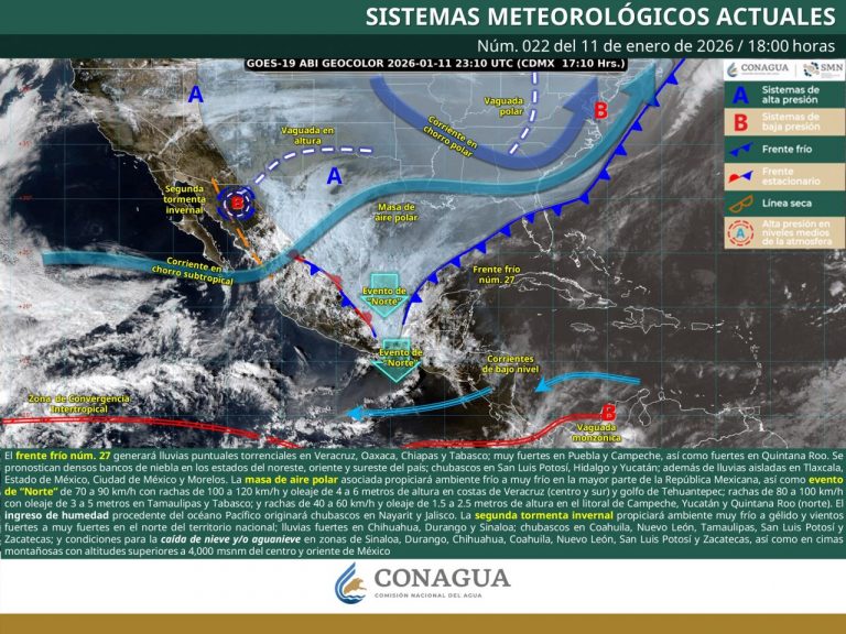 Frente frío 27 provoca lluvias torrenciales y frío extremo en México