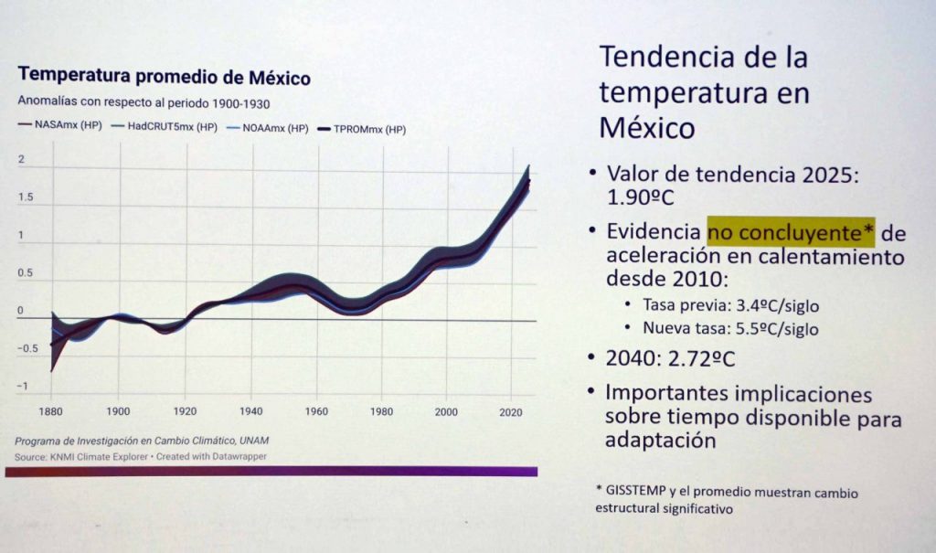 “Ya nos hemos calentado más que el planeta y lo estamos haciendo a una velocidad mayor; nos llevó a un valor de 1.9 grados centígrados en 2025 y estamos cerca de alcanzar los dos grados”, indicó Estrada Porrúa.