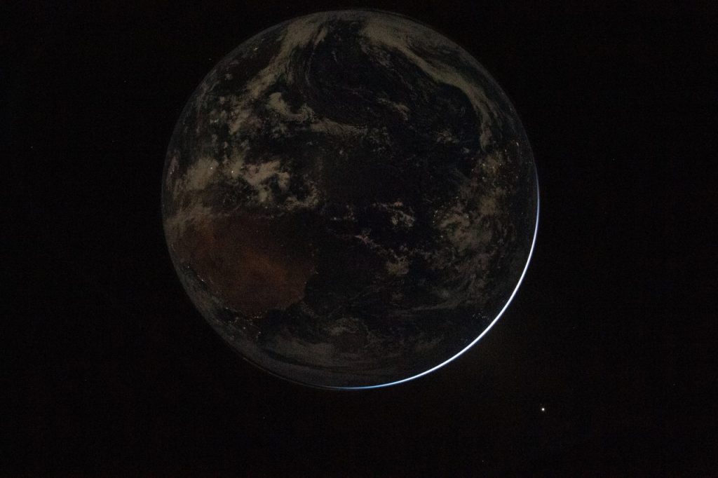 Otra de las capturas muestra la superficie terrestre en la oscuridad, donde destacan las luces eléctricas de actividad humana, mientras que en el borde del planeta se observa la luz solar.