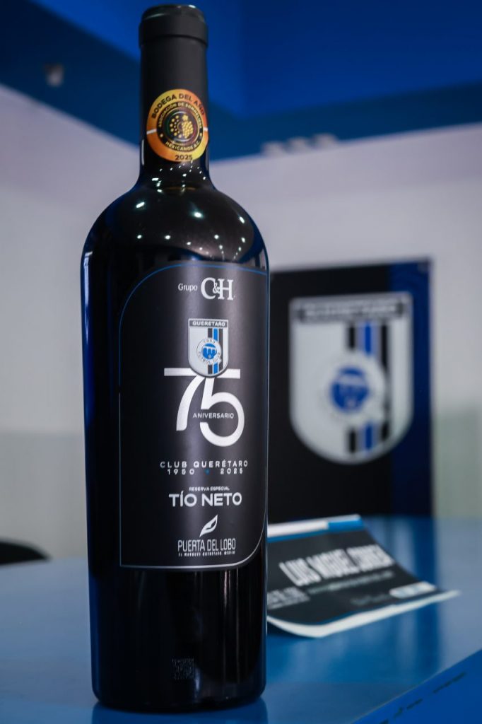 Club Querétaro presentó una botella conmemorativa del vino Tío Neto, elaborada en colaboración con el viñedo Puerta del Lobo y Grupo C&H, como parte de los festejos del 75 aniversario.
