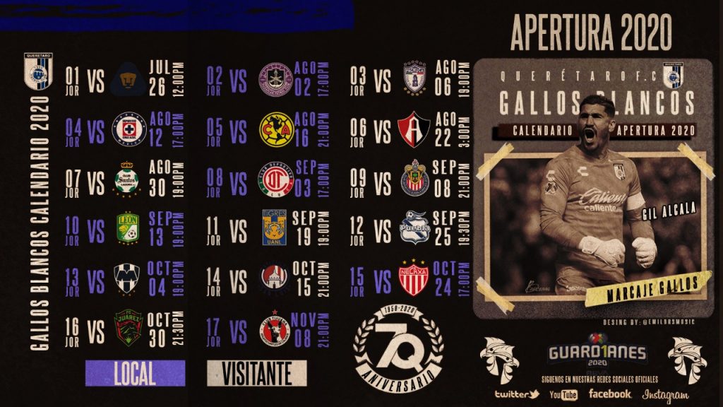 hablando del equipo local los Gallos Blancos de Querétaro, cabe comentar que iniciarán visitando a Pumas el próximo 26 de julio juego a realizarse en el estadio Olímpico Universitario a Puerta cerrada y culminarán la fase regular en casa, en la jornada 17 cuando reciba a los Xolos de Tijuana el 08 de Noviembre .