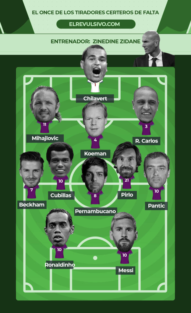 Somos conscientes de que en esta alineación faltan muchos que también merecen ser titulares: Zico, Maradona, De la Peña… Sobre nuestro césped no pueden estar todos los que son, pero sí son todos los que están. Tipos a los que les ponías un balón parado y te lo mandaban donde menos se lo esperaba el guardameta rival. O peor todavía para el cancerbero: donde sí se lo esperaba, pero le era imposible llegar a tiempo.