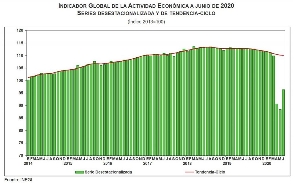 Sin embargo,  el Indicador Global de la Actividad Económica, una estimación mensual de la economía, indica que luego de la caída de -17.5% en abril y -2.4% en mayo, durante junio hubo una recuperación parcial al incrementar 8.9%