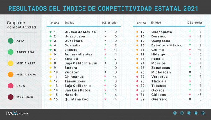 Los cinco estados de la República con una competitividad alta o adecuada, de acuerdo con el Indice de Competitividad Estatal 2021 elaborado por el IMCO son: la Ciudad de México, Nuevo León, Querétaro, Coahuila y Jalisco.