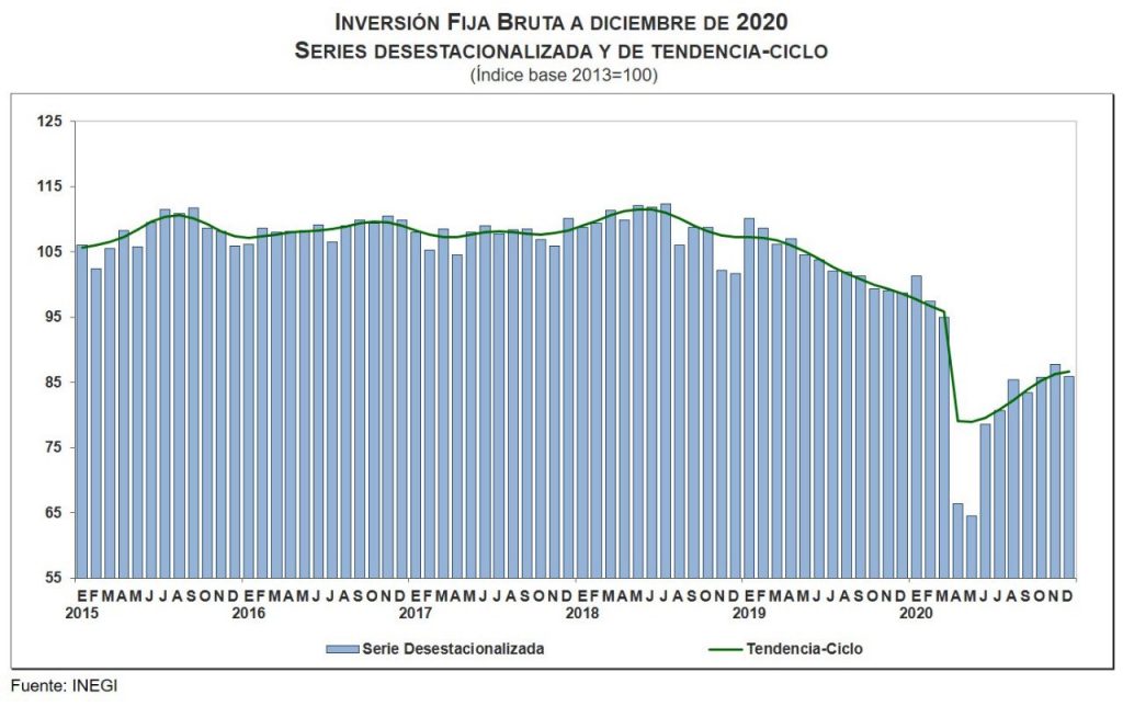 “La Inversión Fija Bruta inició a descender a mediados de 2018, se desplomó en el bimestre abril-mayo 2020 y posteriormente se ha recuperado parcialmente”, explicó.