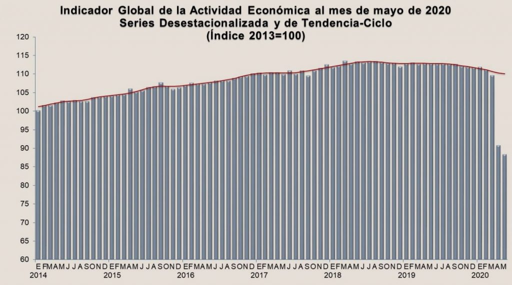 El INEGI informó que el Indicador Global de la Actividad Económica, una estimación mensual del la economía, mostró una disminución de -2.6% en términos reales en el quinto mes del presente año respecto al mes previo, con cifras desestacionalizadas.