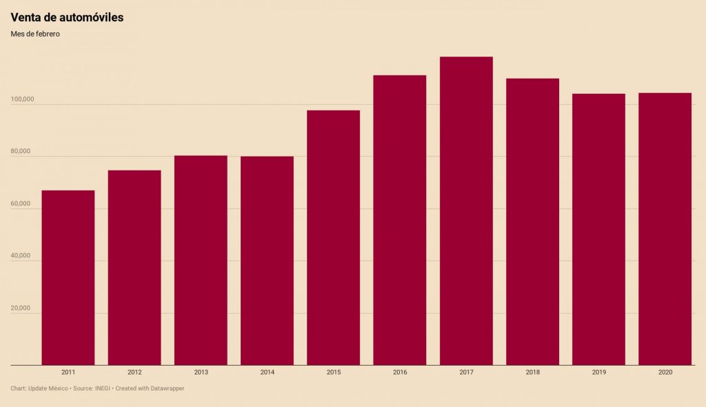 Para febrero de 2020, las ventas sumaron 104,328 unidades, es decir, 339 unidades más que el mismo mes del año pasado, lo cual significa un incremento de solo el 0.33%.