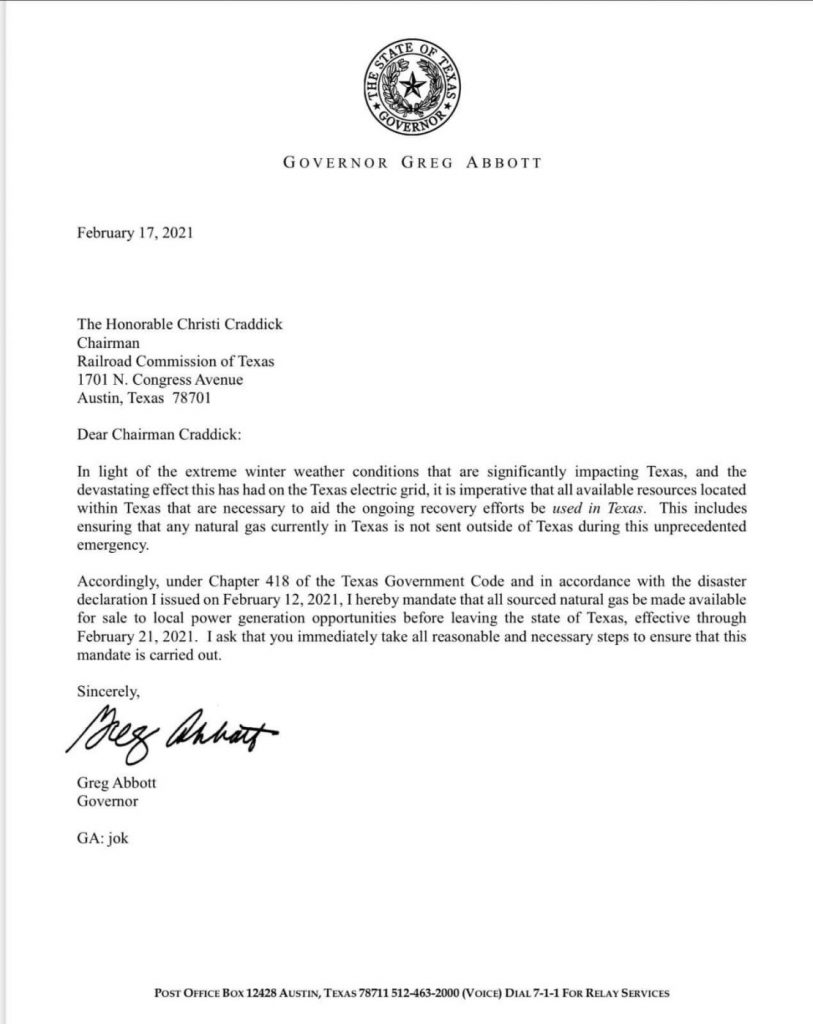 El gobernador del estado, Greg Abbott, emitió una orden que obliga a los productores de energía vender solamente a empresas eléctricas de Texas.