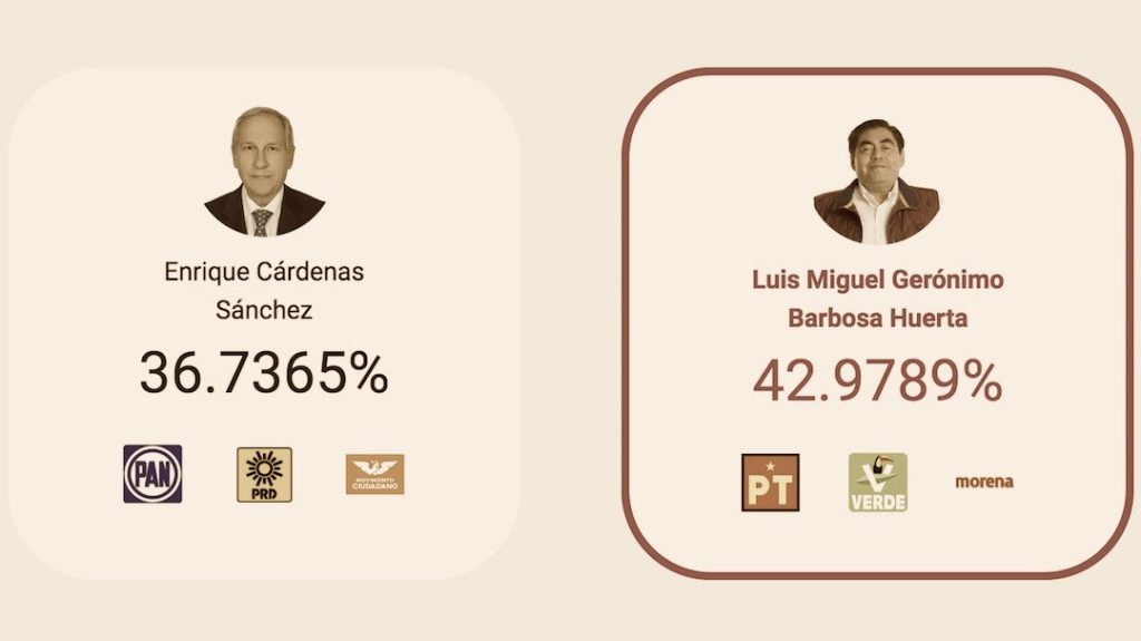Al corte de las 22:10 horas, el Programa de Resultados Electorales Preliminares -con unavance del 69% de las actas computadas- reporta que el candidato de la coalición Juntos Haremos Historia, Luis Miguel Barbosa, adelanta en la elección de gobernador con el 42.9% de los votos.