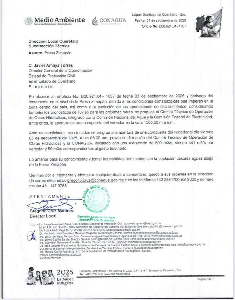 La Comisión Nacional del Agua (CONAGUA) informó que este viernes 5 de septiembre a las 08:00 horas se abrirá una compuerta de la presa Zimapán para desfogue, debido al incremento en su nivel y a los pronósticos de lluvias.