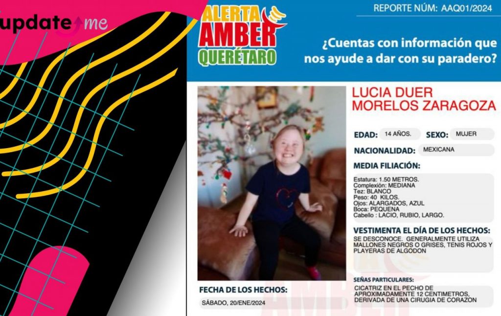 Se emite una ALERTA AMBER urgente para localizar a Lucía Duer Morelos Zaragoza, una joven de 14 años de edad, desaparecida desde el 19 de enero a las 16:30 horas en el Fraccionamiento Mirador San Xavier, Querétaro.