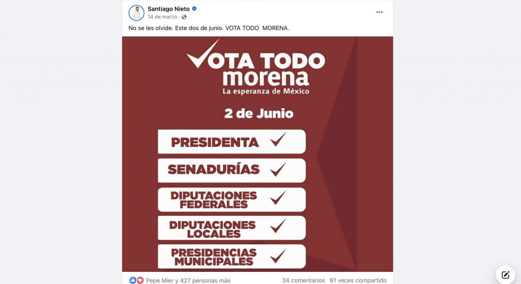 El “post” en redes sociales incluía dos imágenes relacionadas con su candidatura al Senado y la candidatura presidencial de Claudia Sheinbaum, en la que pedía “Vota TODO Morena La esperanza de México”.