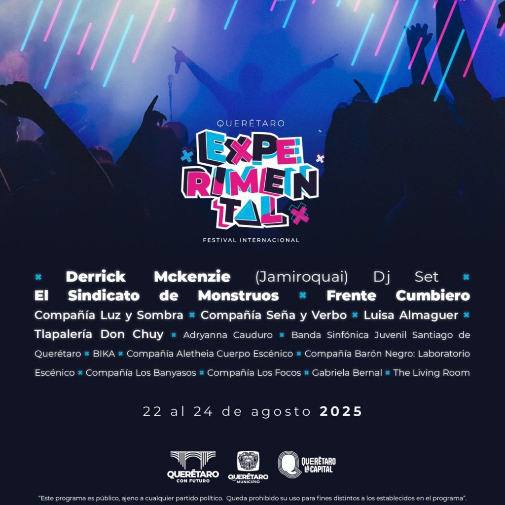 La Secretaría de Cultura del municipio de Querétaro anunció el cartel de la cuarta edición del festival Querétaro Experimental, que se llevará a cabo del 22 al 24 de agosto del 2025 en el Centro Histórico, con la presentación estelar de Derrick McKenzie, DJ y baterista de la banda británica Jamiroquai.