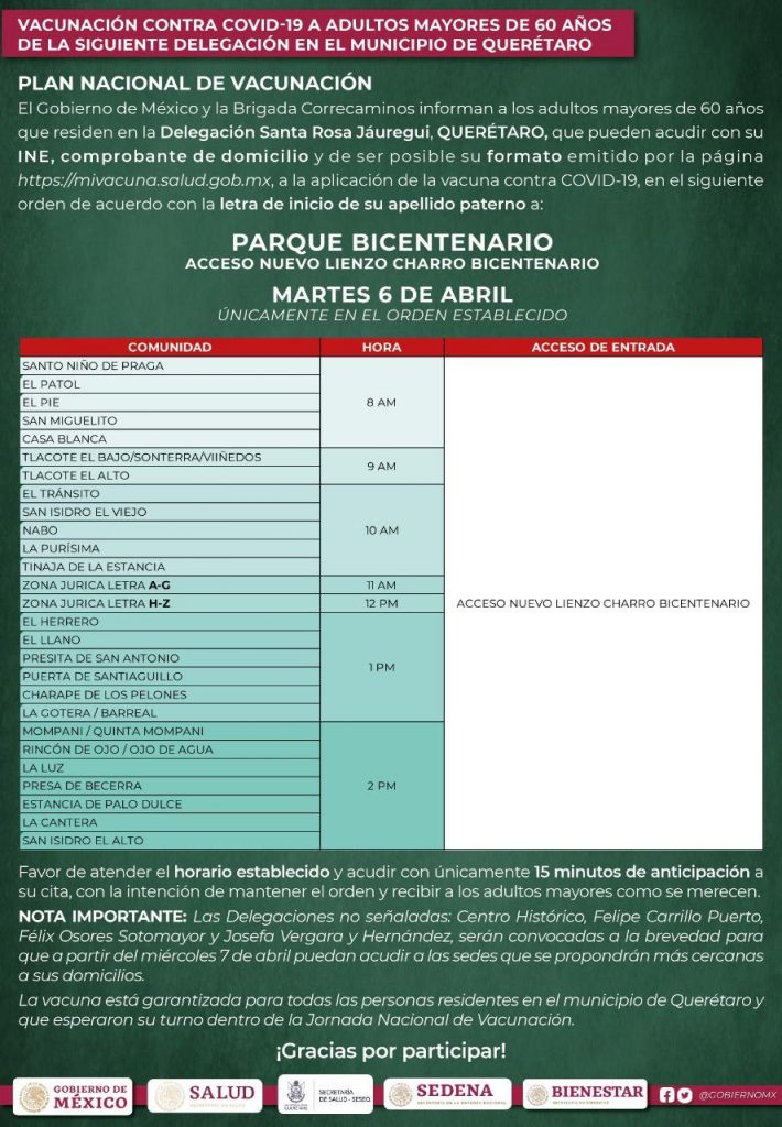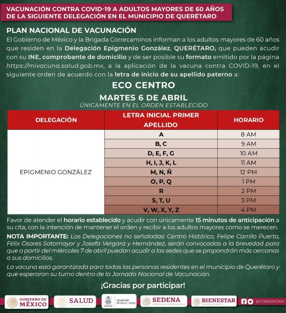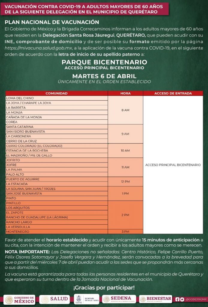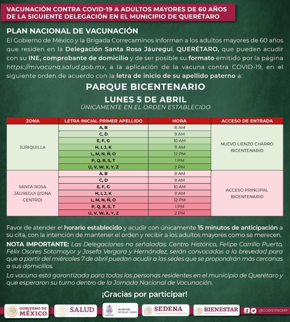 El gobierno federal anunció los horarios para la vacunación de adultos mayores residentes en tres delegaciones del municipio de Querétaro.