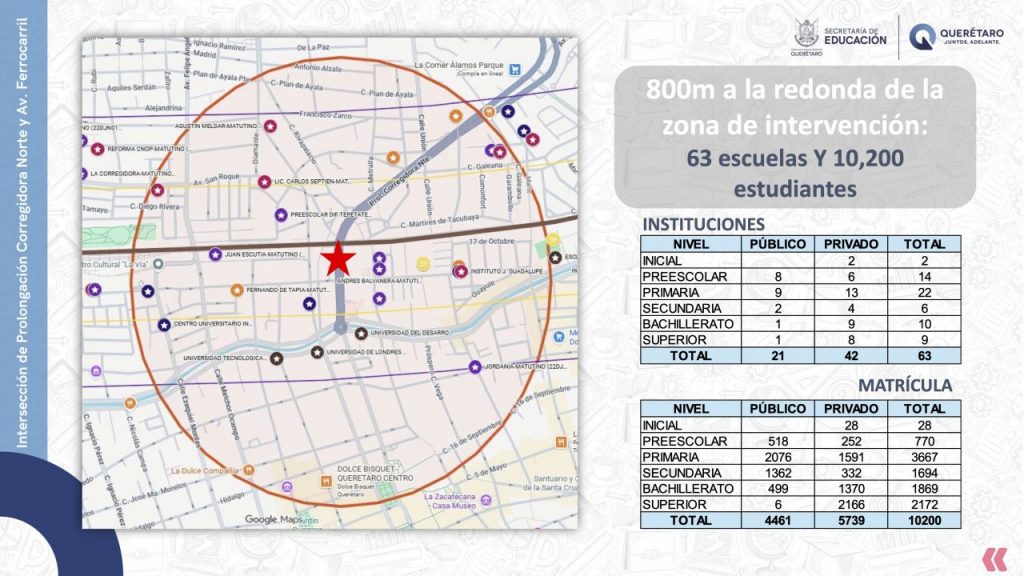 Según datos de la Secretaría de Educación estatal, dentro de un radio de 500 metros de la zona de intervención hay 22 escuelas con una matrícula total de 3,312 estudiantes, mientras que en el perímetro de 800 metros se concentran 63 planteles que atienden a más de 10,200 alumnos, desde nivel inicial hasta superior.
