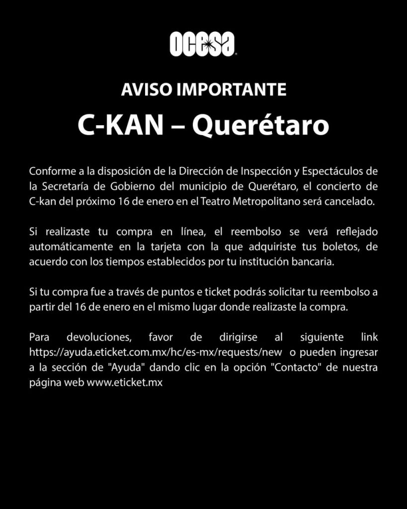El municipio de Querétaro canceló el concierto de C-Kan que estaba programado para este viernes 16 de enero en el Teatro Metropolitano, debido a que su repertorio incluía canciones con contenido violento.