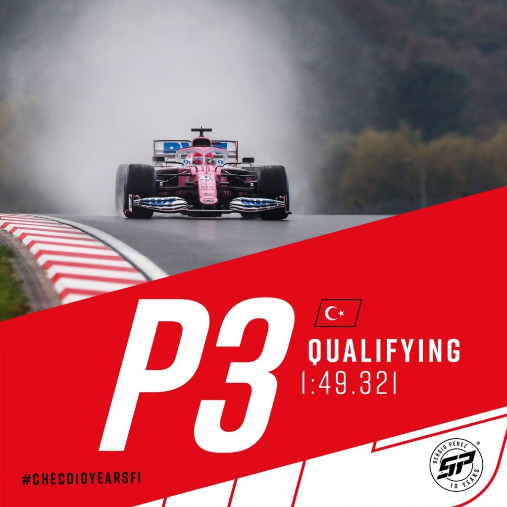 El piloto mexicano Sergio Pérez, a bordo de su monoplaza de la escudería Racing Point, arrancará en el tercer lugar de la parrilla al disputarse este domingo el Gran Premio de Turquía de la Fórmula 1.