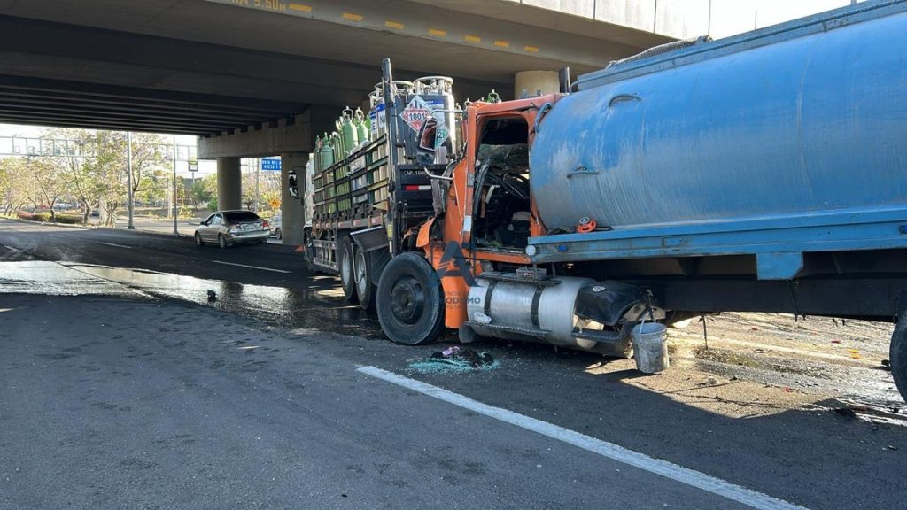 Una pipa que transportaba agua no logró frenar e impactó a un camión plataforma que llevaba tanques de oxígeno y nitrógeno, así como a un camión de volteo y a un vehículo particular.