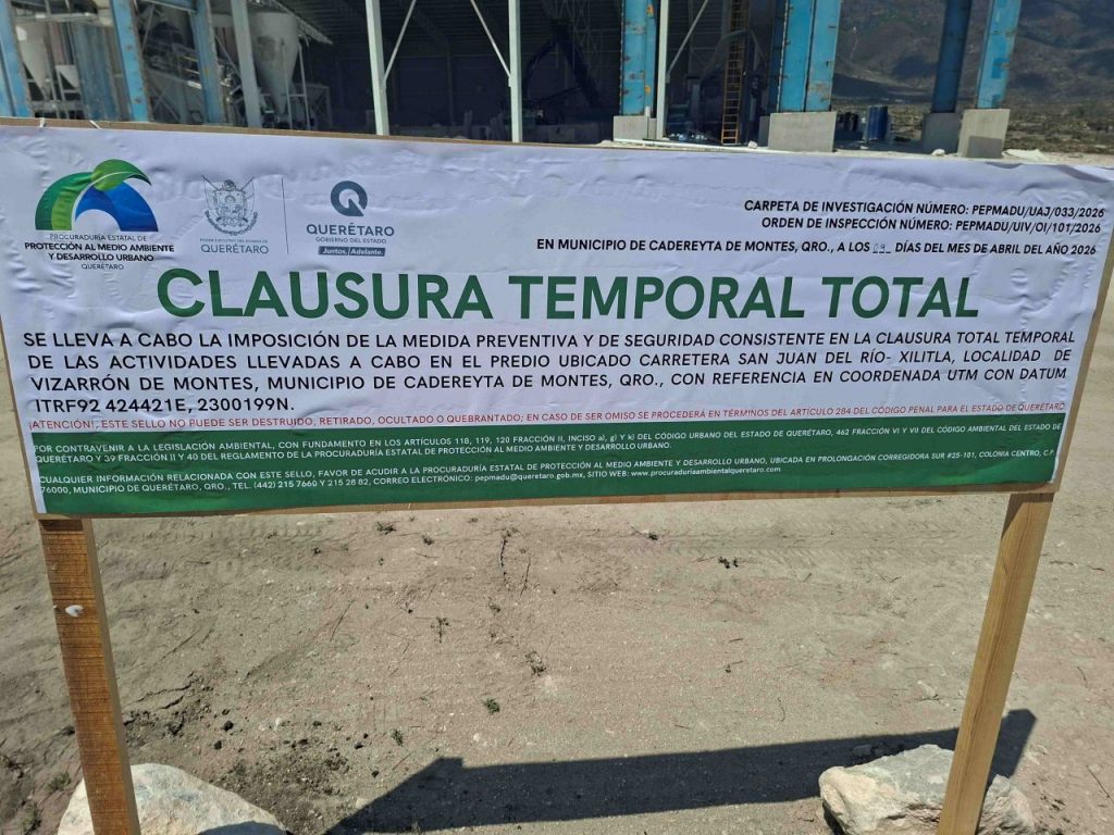 La Procuraduría Estatal de Protección al Medio Ambiente (PEPMADU) clausuró de forma temporal total una planta de trituración y molienda de material pétreo en Vizarrón de Montes, municipio de Cadereyta, tras denuncias ciudadanas por exceso de polvo.