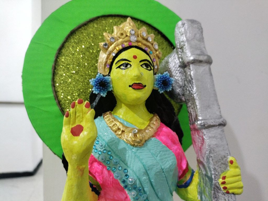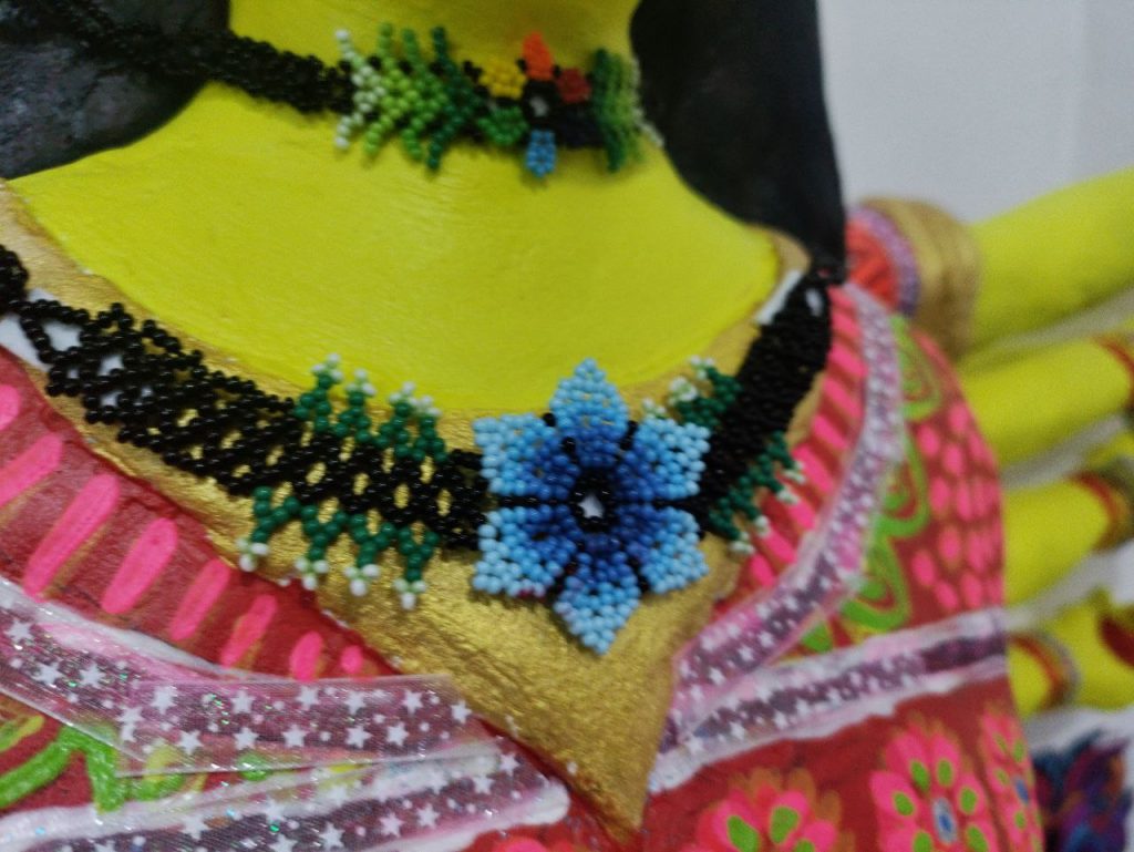 En primer lugar, a la diosa Durga le pusieron unos aretes y un collar en forma de flores hechos con chaquira, al estilo del arte huichol; mientras la parte alta de su blusa tiene grecas que recuerdan los grabados que se encuentran en las pirámides de las culturas prehispánicas de México.