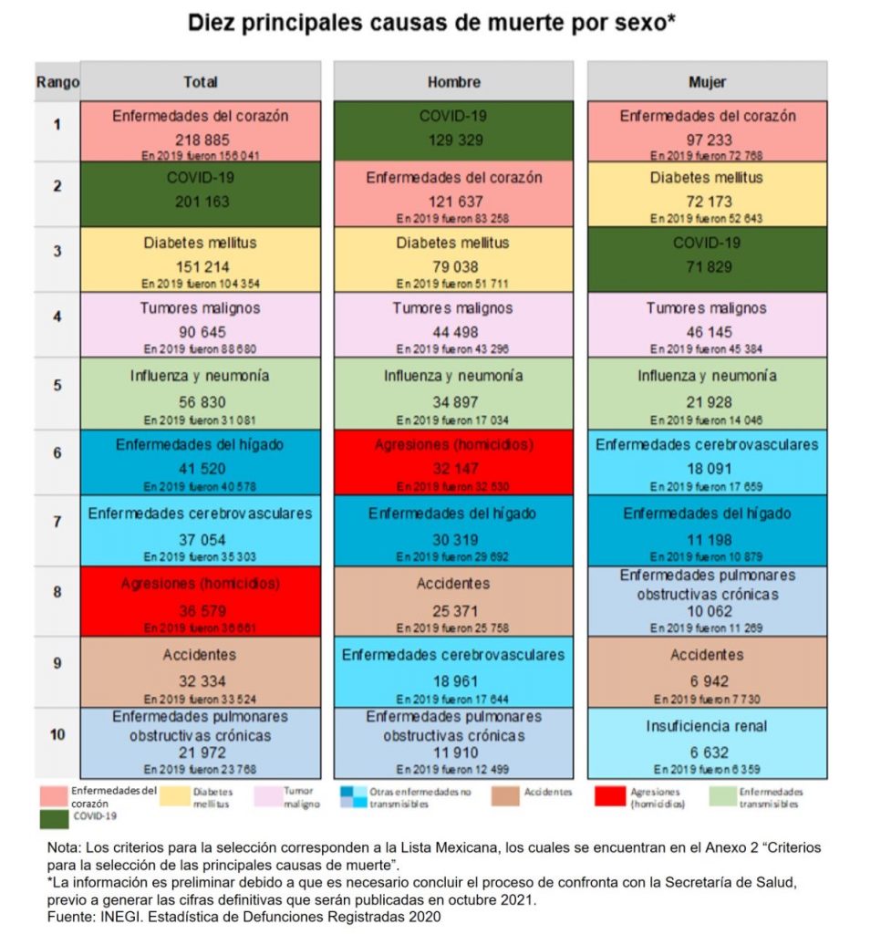 En México, la primera causa de muerte durante el año 2020 fueron las enfermedades del corazón con 218 mil 885 casos, seguidas por COVID-19 (201,163) y la diabetes mellitus (151,214).