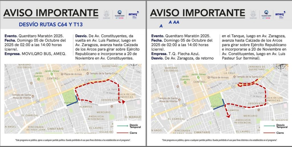La Agencia de Movilidad del Estado de Querétaro (AMEQ) informó que 67 rutas de Qrobús modificarán su recorrido de manera temporal este fin de semana debido al Querétaro Maratón 2025.