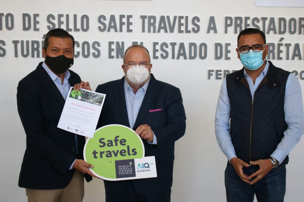 La Secretaría de Turismo Estatal llevó a cabo la entrega de Sellos Safe Travels al Aeropuerto Intercontinental de Querétaro (AIQ), al municipio de El Marqués y a siete prestadores de servicios turísticos que cumplen con la aplicación correcta de los protocolos sanitarios en el marco de la pandemia por Covid-19.