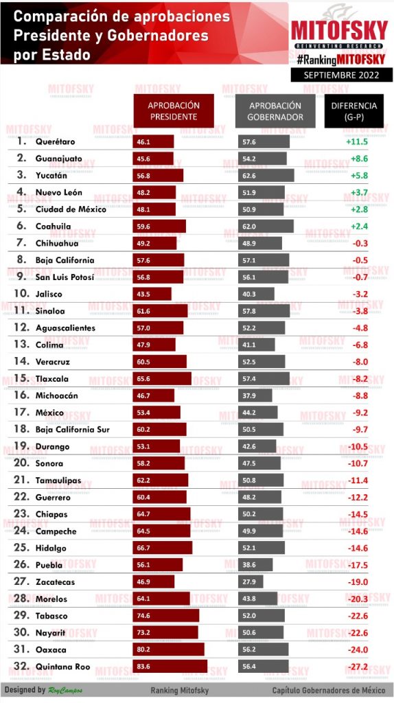En los otros 26 estados, López Obrador tiene una mayor aprobación que su respectivo gobernador.