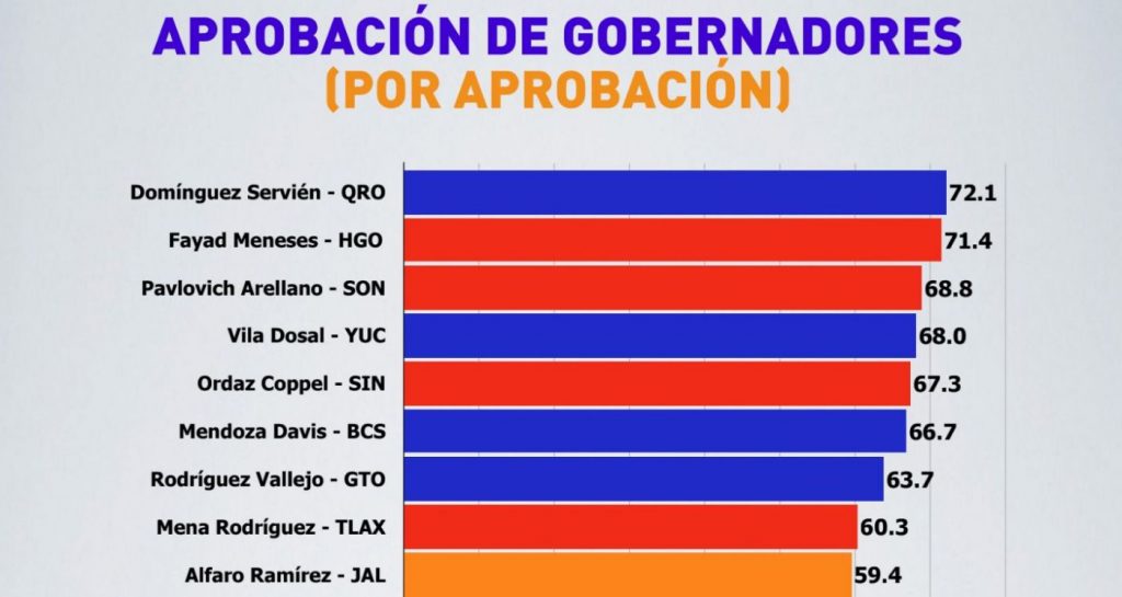 Respecto de la aprobación entre los ciudadanos, el gobernador de Querétaro reporta los niveles más altos del país, con el 72.1%, seguido del mandatario de Hidalgo, Omar Fayad, con 71.4%, y la sonorense Claudia Pavlovich, con 68.8%.