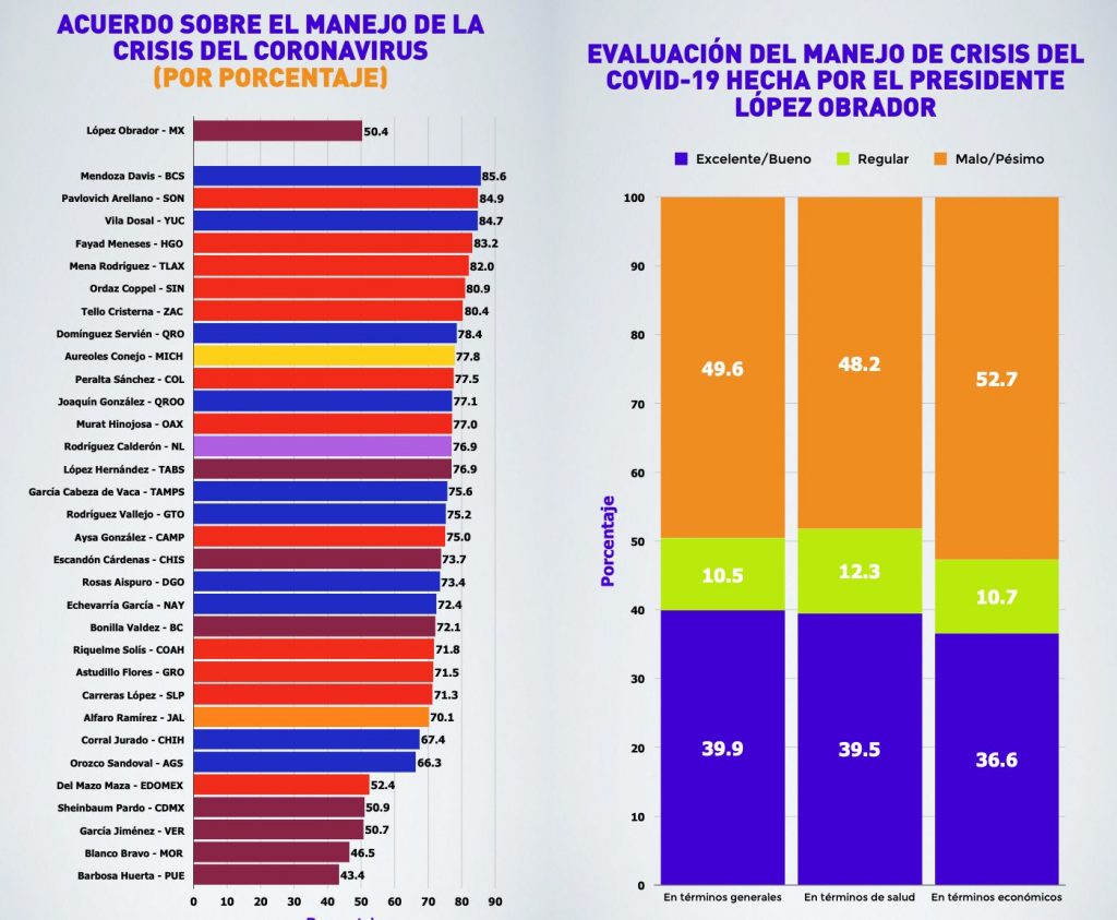 Mientras el acuerdo sobre el manejo de la crisis es de 50.4% para el presidente de la República, Andrés Manuel López Obrador, 30 de los 32 gobernadores tienen un nivel de acuerdo superior.