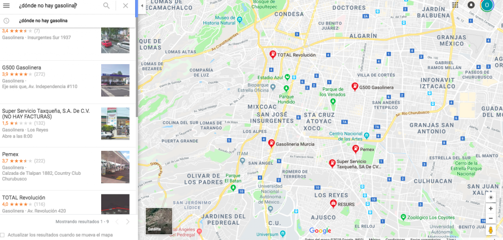 Lo único que tienes que hacer es ingresar a la aplicación o a la página de Google Maps y escribir en el buscador ¿Dónde hay gasolina en Querétaro? -o en la localidad que elijas-. De igual forma puedes hacer lo mismo al preguntar ¿Dónde no hay gasolina en Querétaro? -o en el lugar que desees- y se despliegan las gasolineras.
