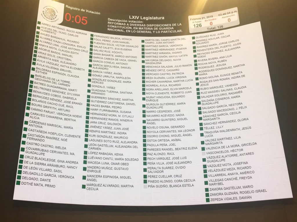 El Senado de la República aprobó por unanimidad -con 127 votos a favor, cero en contra y cero abstenciones- el proyecto de Guardia Nacional que propuso el presidente de México, Andrés Manuel López Obrador.