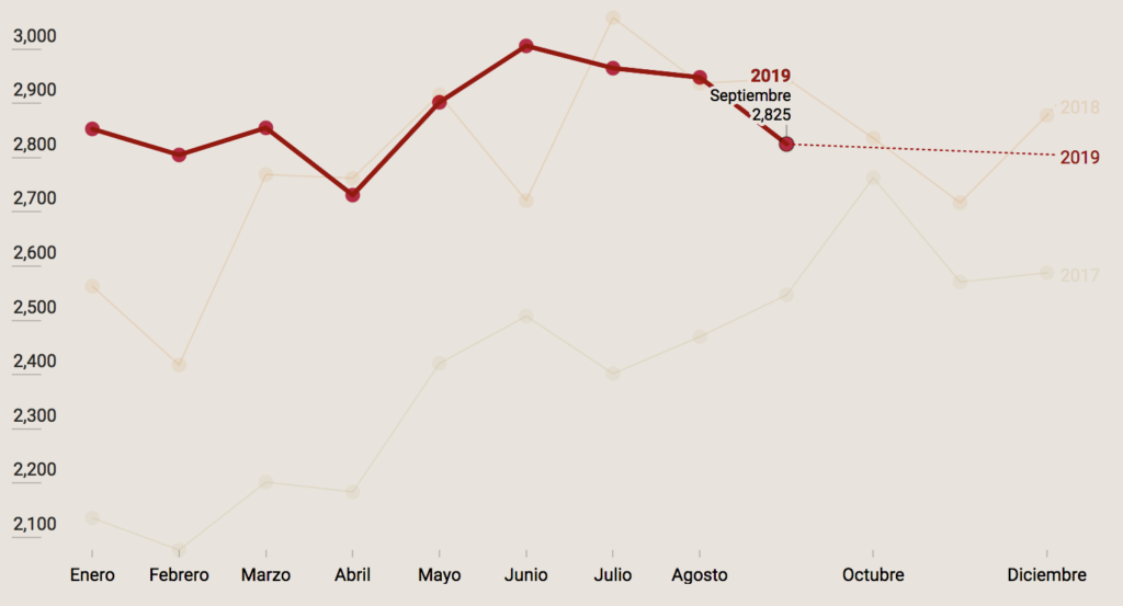 Septiembre de 2019 representa una disminución de 4.17% frente a los 2,948 homicidios registrados durante agosto pasado.
