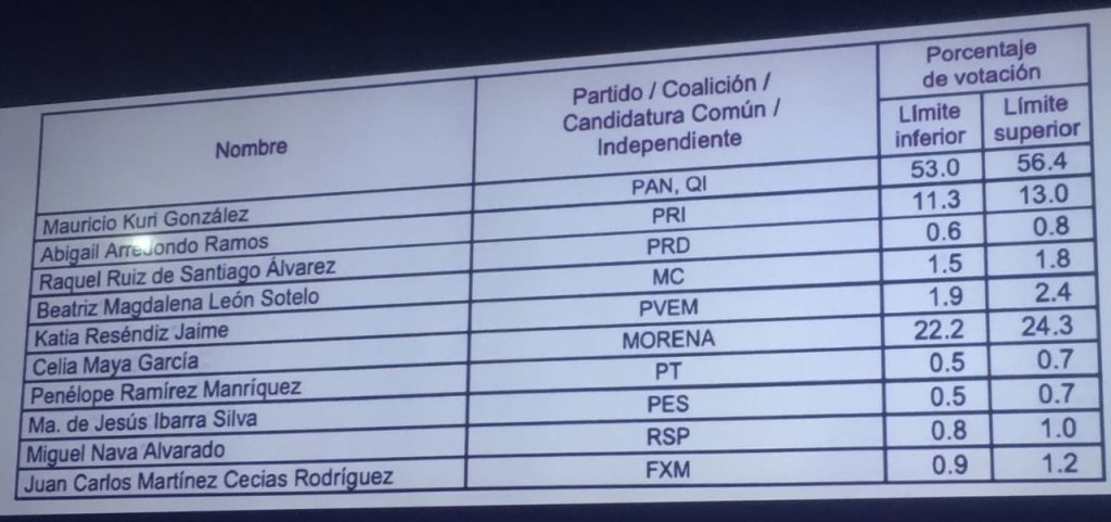 Mauricio Kuri obtuvo un porcentaje de votación entre el 53 y 56 por ciento; mientras que su contendiente más cercano, la candidata de Morena, Celia Maya, entre el 22.2 y 24.3 por ciento.
