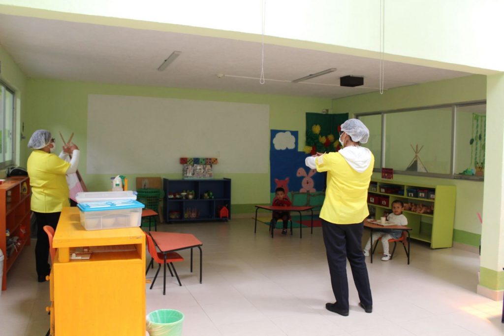 Dentro de las instalaciones se tiene un aforo máximo de 50 por ciento de la capacidad de cada guardería, además de mantener la sana distancia entre niños, las mesas fueron espaciadas, así como las sillas que usan.
