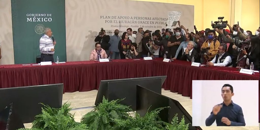 Durante un evento en Huauchinango, Puebla, un grupo de manifestantes damnificados por el huracán Grace irrumpió en un evento del presidente Andrés Manuel López Obrador.