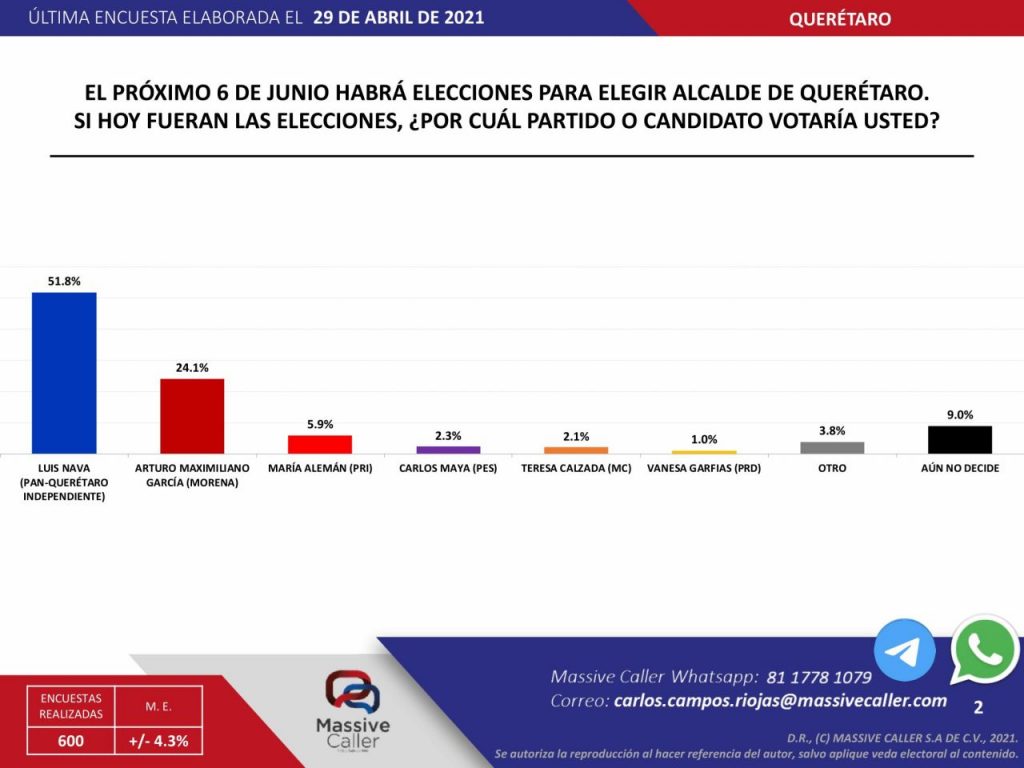 El candidato del Partido Acción Nacional (PAN) y Querétaro Independiente (QI), Luis Nava, ganaría la Presidencia Municipal de Querétaro si hoy fueran las elecciones, revela un estudio de la firma Massive Caller.