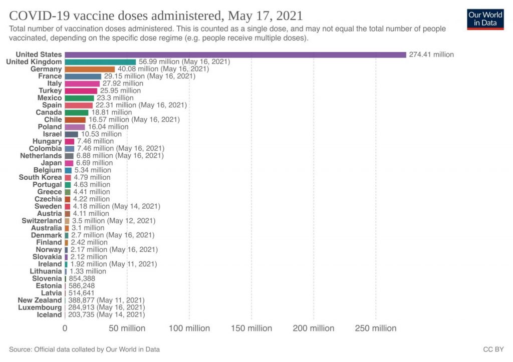 Al corte del 17 de mayo de 2021, los primeros 10 puestos en aplicación de dosis de vacuna en la OCDE los ocupan: