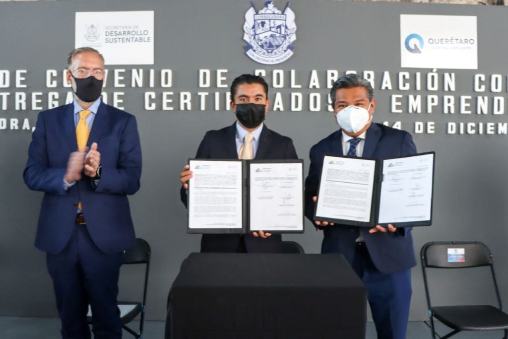 Roberto Sosa Pichardo, presidente municipal de Corregidora, encabezó la firma del convenio de colaboración del Municipio con la Universidad Tecnológica de Querétaro (UTEQ) para impulsar a los emprendedores del municipio. En el evento, en el que estuvo presente Marco del Prete Tercero, secretario de Desarrollo Sustentable del Estado, fueron entregados certificados y reconocimientos a los participantes del diplomado a emprendedores y PyMES.