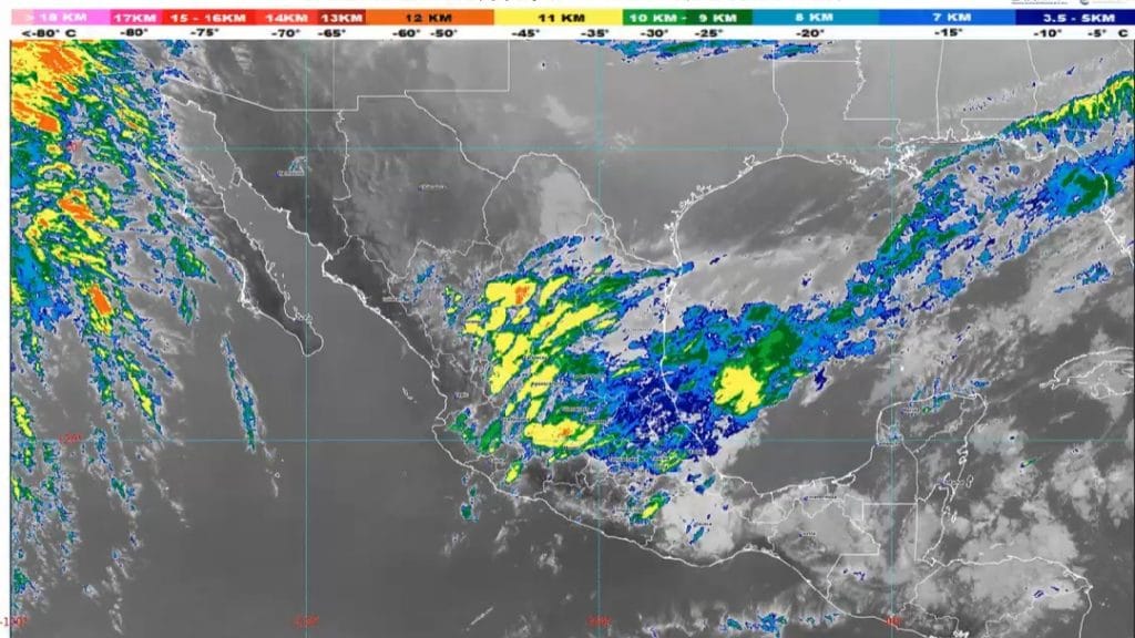 Se pronostican lluvias puntales intensas en Chiapas, Oaxaca y Veracruz; muy fuertes en Tabasco; fuertes en Campeche y Puebla; intervalos de chubascos en la Ciudad de México, el Estado de México, Guerrero, Hidalgo, Michoacán, Quintana Roo y Yucatán, y lluvias aisladas en Jalisco, Morelos, Querétaro, San Luis Potosí y Tlaxcala.