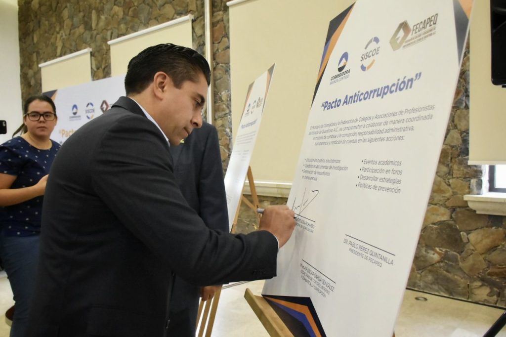 Se llevó a cabo la firma del Pacto Anticorrupción entre el municipio de Corregidora, que encabeza Roberto Sosa Pichardo y la Federación de Colegios y Asociaciones de Profesionistas del Estado de Querétaro (FECAPEQ), que preside Pablo Pérez Quintanilla, con el objetivo de desarrollar estrategias para fortalecer la vinculación institucional sobre aspectos académicos, legales y administrativos en materia de transparencia, acceso a la información, rendición de cuentas, protección de datos y combate a la corrupción.