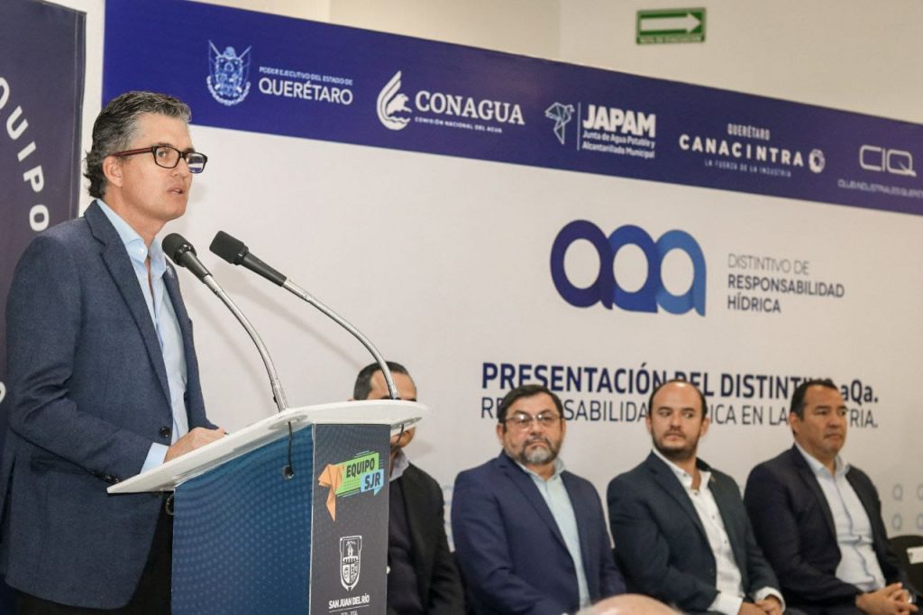 Con el distintivo aQa de Responsabilidad Hídrica en la Industria -cuyo objetivo es promover la participación de este sector, donde las empresas garanticen el cumplimiento de las disposiciones en materia de agua y reflejar su compromiso con el uso y preservación de esta-, el estado de Querétaro y el municipio de San Juan del Río, en equipo, tienen la oportunidad de ser un ejemplo nacional e internacional, dijo el presidente municipal sanjuanense, Roberto Cabrera Valencia.
