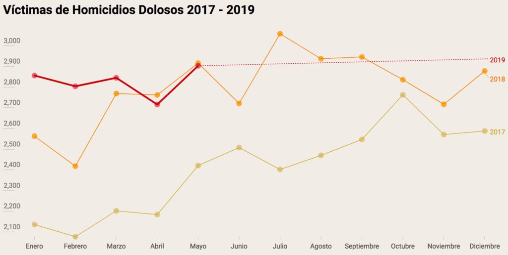 El mes de mayo de 2019 cerró con 2,903 víctimas de homicidio doloso, cifra ligeramente menor que la del mismo mes de 2018, cuando se ubicó en 2,916, pero superior a la de abril de 2019 cuando había descendido a 2,716.