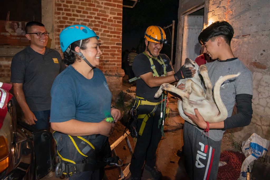 Finalmente, la Cabo María Bertha Sánchez Beltrán, integrante de Bomberos de El Marqués, fue la encargada del descenso y extracción del perrito, quien se aseguró del rescate por medio de un costal. Manifestó que parte de su trabajo fue darle confianza al animal a través del acercamiento, haciéndole caricias y hablándole para evitar alguna agresión. “…estoy muy satisfecha, es la primera vez que rescató a un perro de un lugar tan profundo, (…) es complicado por el espacio y por no saber si existe algún peligro”.
