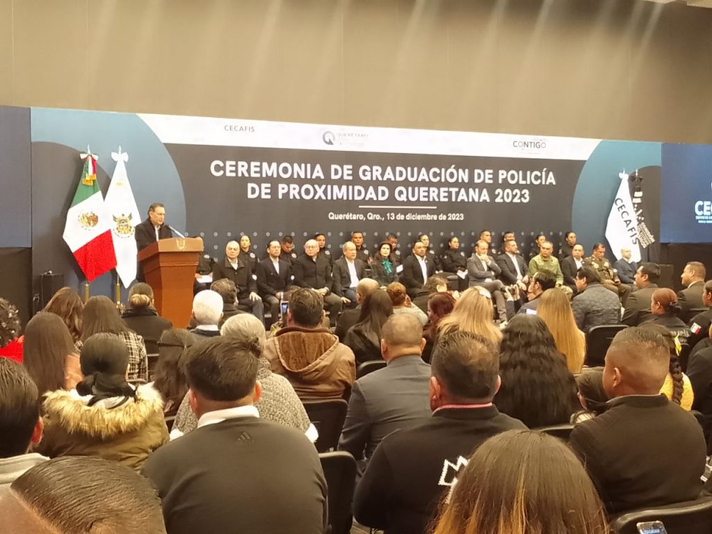 El gobernador del estado, Mauricio Kuri González, encabezó la ceremonia de graduación de 59 policías de proximidad queretana 2023, quienes rindieron protesta.