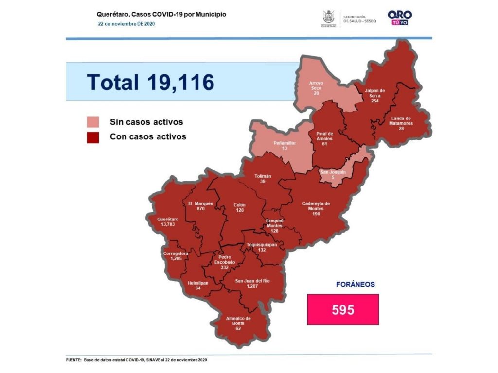 El estado de Queretaro registró 515 casos nuevoa de COVID-19; se trata de 252 mujeres, entre ellas una de cuatro años, y 263 hombres, 252 mujeres, entre ellas una de cuatro años, y 263 hombres, entre ellos uno de ocho años y uno de nueve.